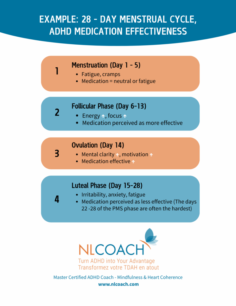 Premenstrual period (PMS): Often the hardest phase: drop in productivity, difficulty regulating emotions, and the feeling that medication “stops working.”
