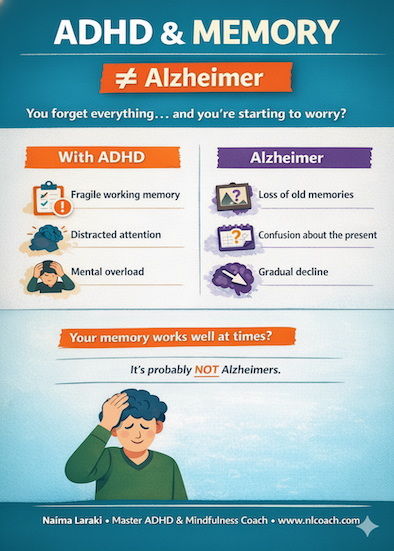 In my work with adults living with ADHD, I very often find that what is perceived as a “memory problem” is linked to fragile working memory and fluctuations in attention. With my clients—leaders, professionals, entrepreneurs, and students—we explore the unique functioning of their brains together. We implement concrete strategies to support working memory, structure the environment, and strengthen self-regulation. When these systems are in place, forgetfulness decreases sharply, and individuals discover they can function with much more clarity, confidence, and efficiency.