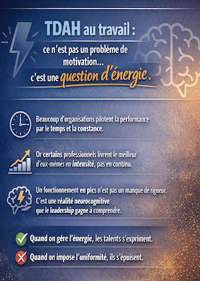En adoptant une culture du résultat et de la flexibilité, les entreprises améliorent non seulement l’inclusion mais aussi la performance globale. Valoriser les forces du TDAH et proposer des aménagements énergétiques adaptés permet de construire un environnement de travail plus humain, plus inclusif et plus efficace pour toutes et tous.