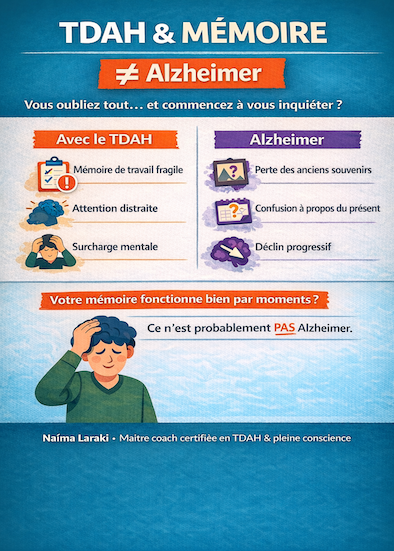Beaucoup d’adultes performants vivant avec le TDAH connaissent ce moment déroutant. Vous oubliez un rendez-vous. Vous perdez un objet que vous aviez dans la main quelques minutes plus tôt. On vient de vous expliquer quelque chose… et l’information semble disparaître. Très souvent une pensée inquiétante apparaît : « Est–ce que ma mémoire se détériore ? » Certaines personnes vont même jusqu’à craindre un problème neurologique sérieux. Pourtant, dans la majorité des cas chez les adultes vivant avec le TDAH, la mémoire à long terme fonctionne très bien. Le défi se situe ailleurs.